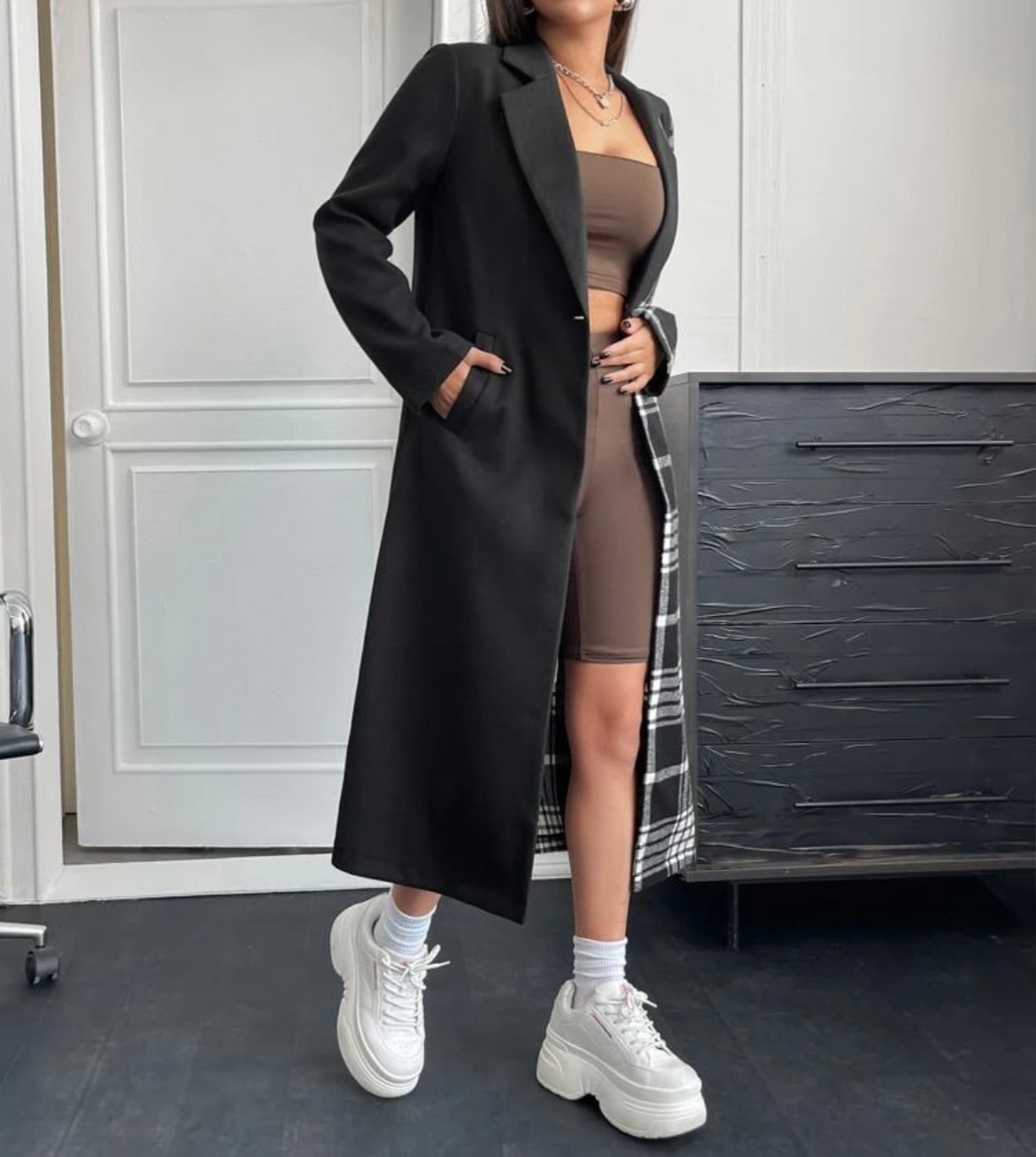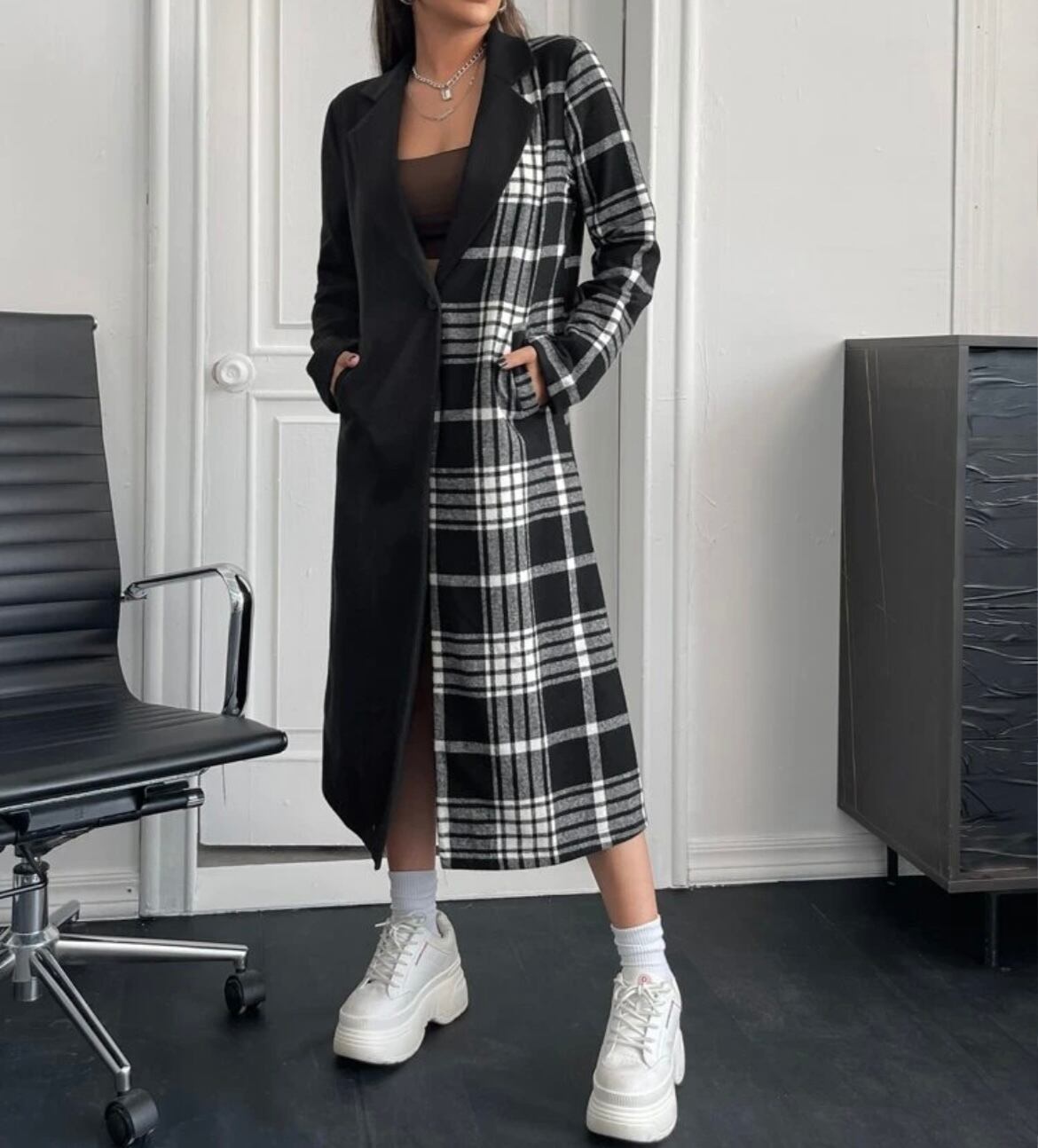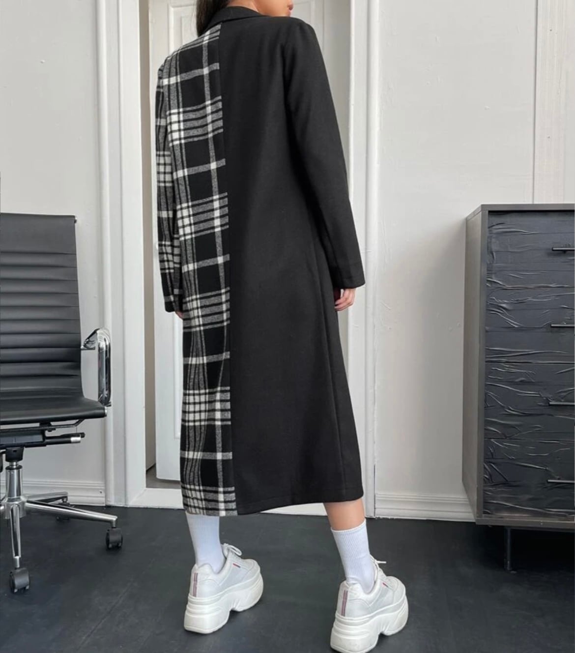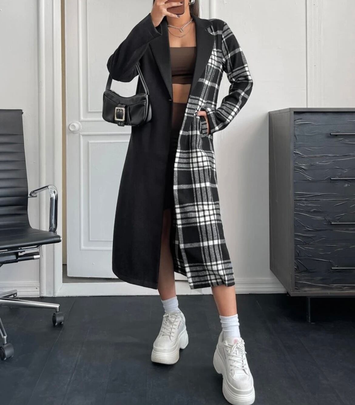★★★★★ チェック×ブラックのバイカラーが素敵なロングコート、今季はuniqueなデザインが豊富